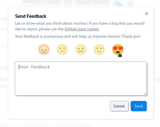 If you'd like your feedback to start a conversation (we'd love to talk with you!), please consider posting in our GitHub issues or Discord. But if you're in a flow state and can't context switch out, the feedback form has your back.